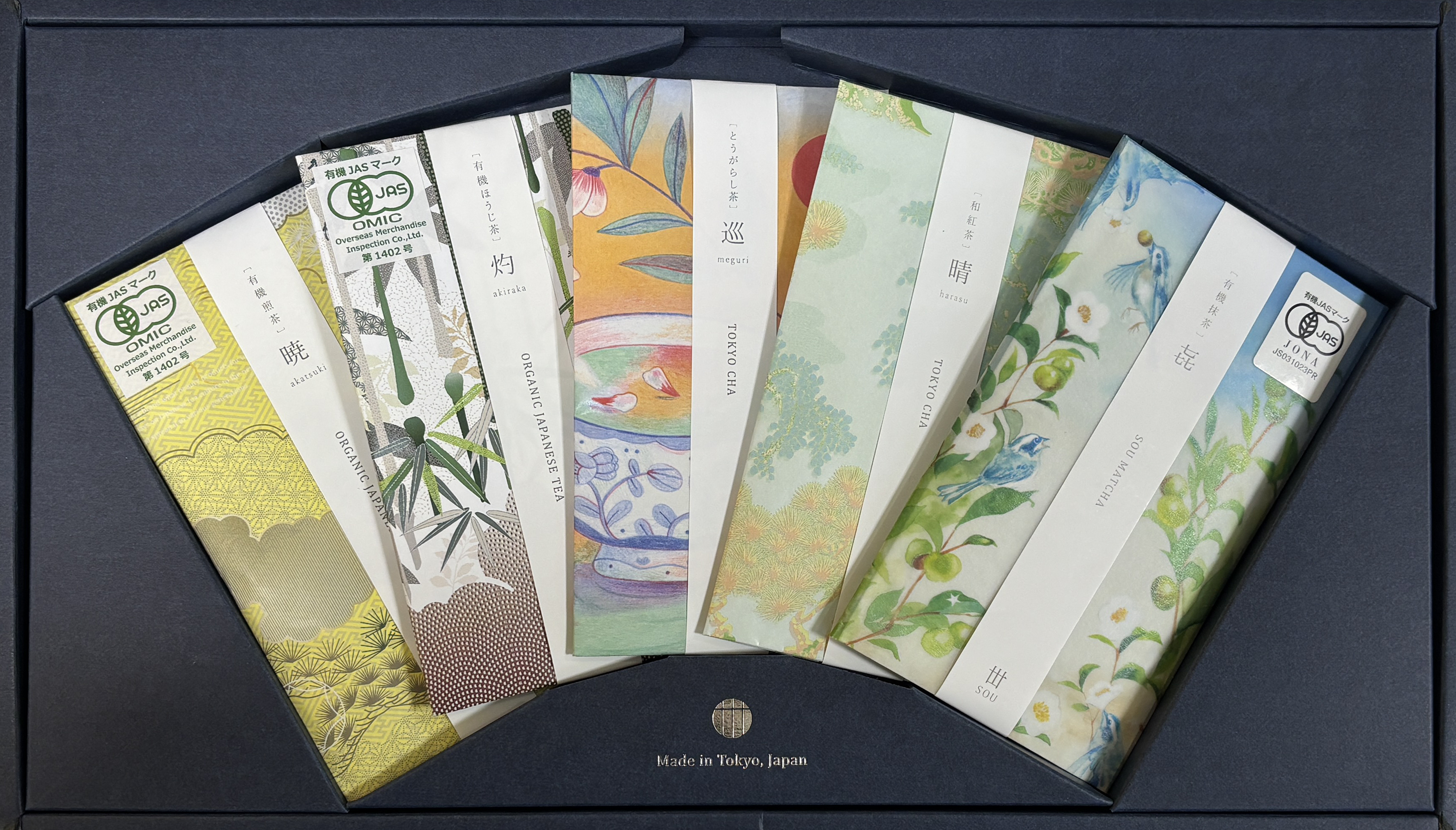 暁(煎茶)・灼(有機ほうじ茶)・巡(とうがらし茶)・晴(和紅茶)・㐂 (有機抹茶) がギフトボックスに1点ずつ入っています。